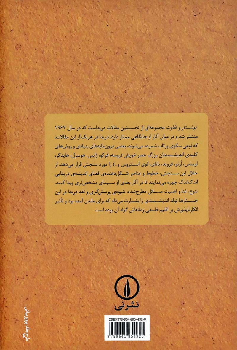 کتاب نوشتار و تفاوت writting and differencde نویسنده: ژاک دریدا مترجم: عبدالکریم رشیدیان انتشارات:نشر نی نوع جلد:جلد سخت قطع:رقعی سال انتشار میلادی:1967 سری چاپ:6 تعداد صفحه:630